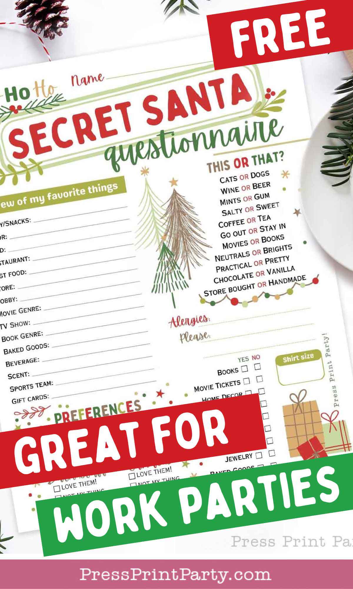 My free printable Secret Santa questionnaire is designed specifically for adults with coworkers in mind. And it’s a PDF file, so you can easily print it out and have everyone fill it in. The text is NOT editable. (Editable version available here)