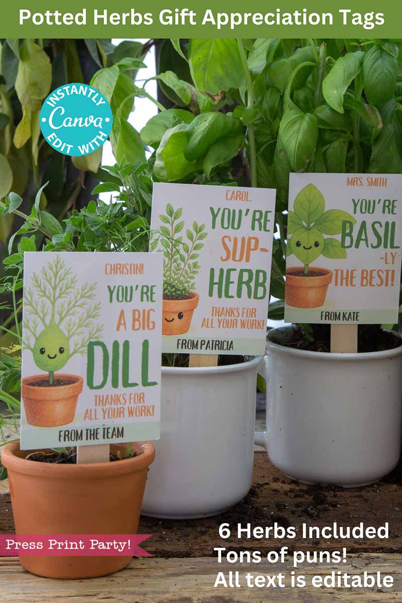Potted Herb Gift Tags Printable Appreciation Teacher Thank You Note Scout Leader Garden Staff Gift Kawaii Funny Plant Cards Office volunteer Instant Download Canva Herb Plant Gift