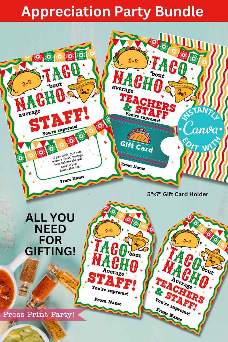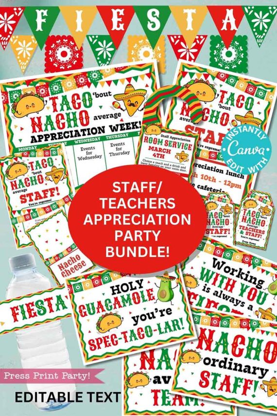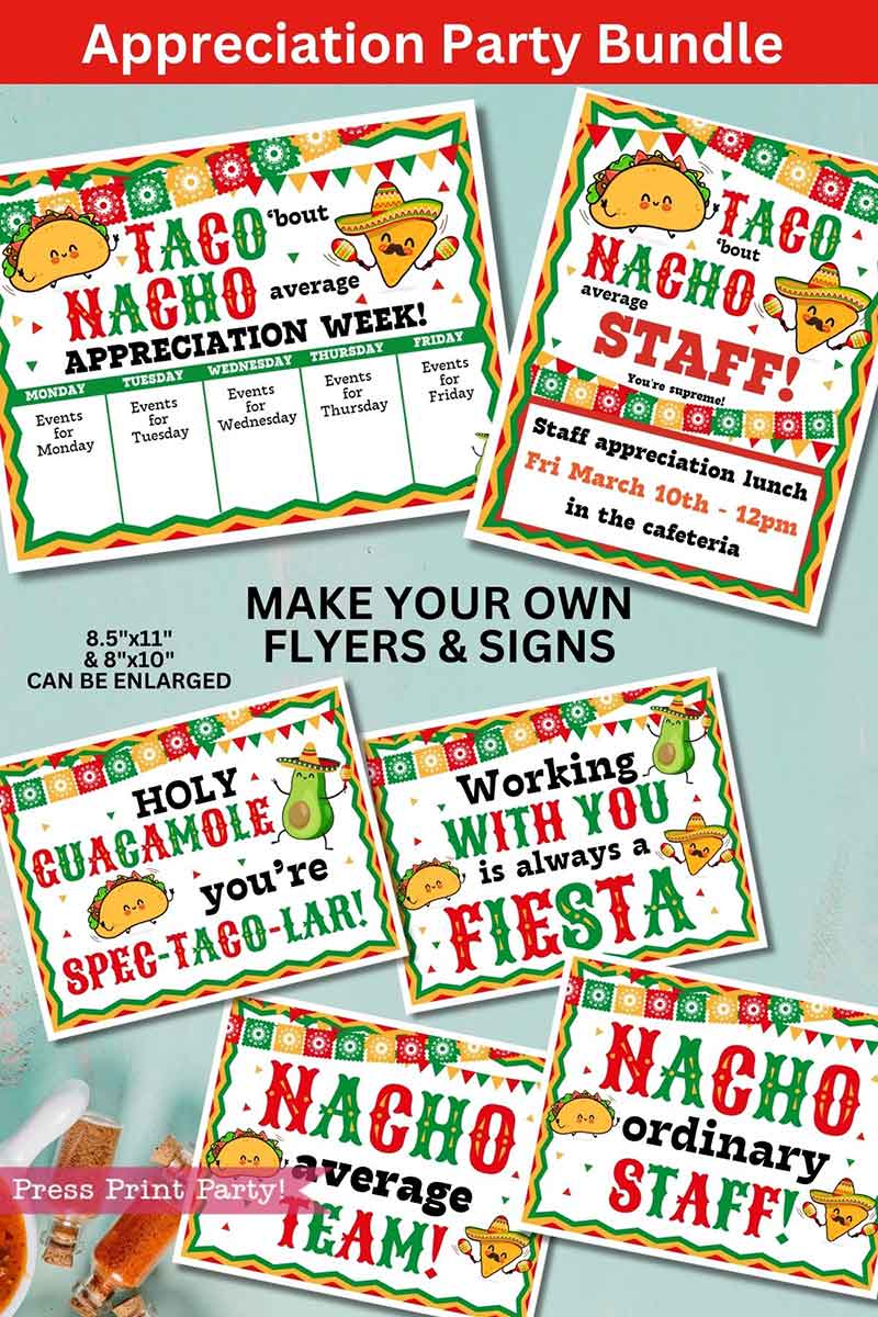 Editable Employee or Teacher Appreciation Week Bundle Taco Nacho Theme Staff Teacher Office Party Printable Itinerary Calendar Sign Room Service Hanger Instant download